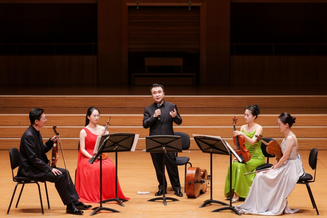 接着,在单簧管演奏家邹汇斌的简单导赏后,木管五重奏的五位艺术家上台,带来了莫扎特的木管五重奏f大调行板和皮亚佐拉的《布宜诺斯艾利斯的四季》之“秋”。音色丰富而细腻,旋律生动而有活力,引人入胜,既展现古典音乐的优雅,又让人领略到现代音乐的魅力,赢得了观众们热烈的掌声。